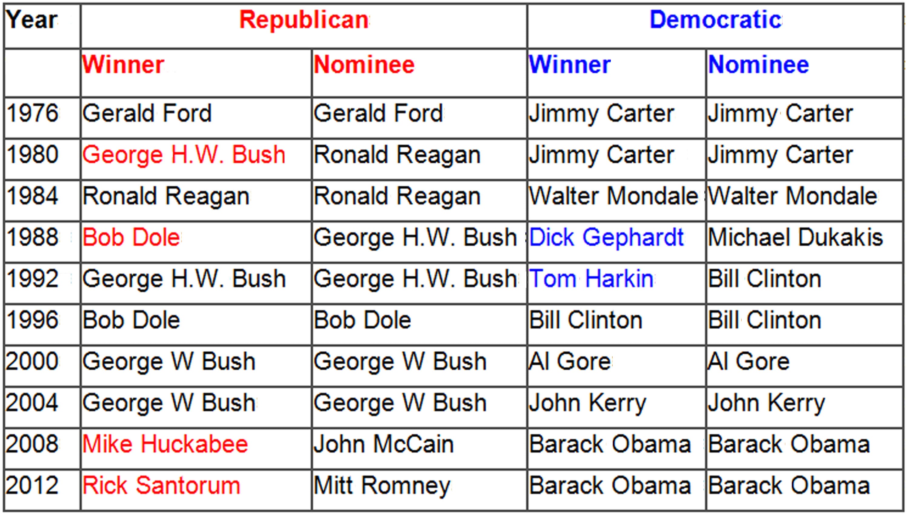 Over the last 40 years, the Iowa caucuses have been used as a bell weather of support for candidates vying for their party’s presidential nomination, and a tool for winners to attract financial support to continue to be competitive in other caucuses and primaries.  The results of the caucuses have also served as the political graveyard for many candidacies. But do the results of the Iowa caucuses accurately predict the nominees?
